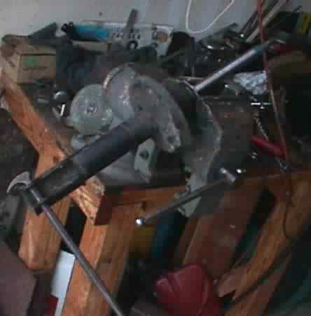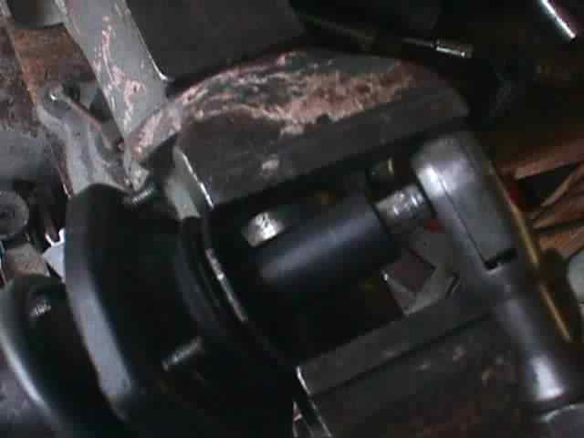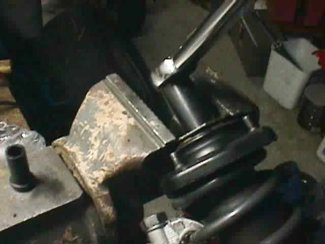 Now use the vice again to grab onto the nut thing holding the cartridge into the strut housing. Put a bunch of WD-40 on it first. Put your crowbar into the end to get some leverage and start twisting. You may need a bigger crowbar or a bigger vise, or a big wrench that will fit the nut. This is probably the hardest part of the whole procedure.